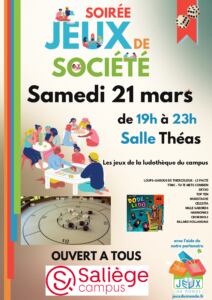 Rendez-vous samedi 21 mars, de 19h à 23h, pour une soirée jeux de société. Le Campus Saliège vous invite à partager un moment convivial ouvert à tous les étudiants.